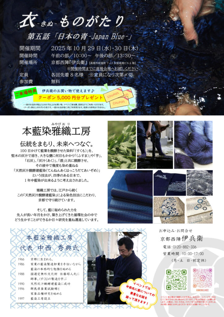 期間中は、本藍染雅織工房代表の中西秀典氏ご来場いただき、藍染の染織技法のこだわについて貴重なお話をお聞きいただけるだけではなく『天然灰汁発酵建藍染』で染めらた素敵なきものや帯のご紹介もいたしますお楽しみに!